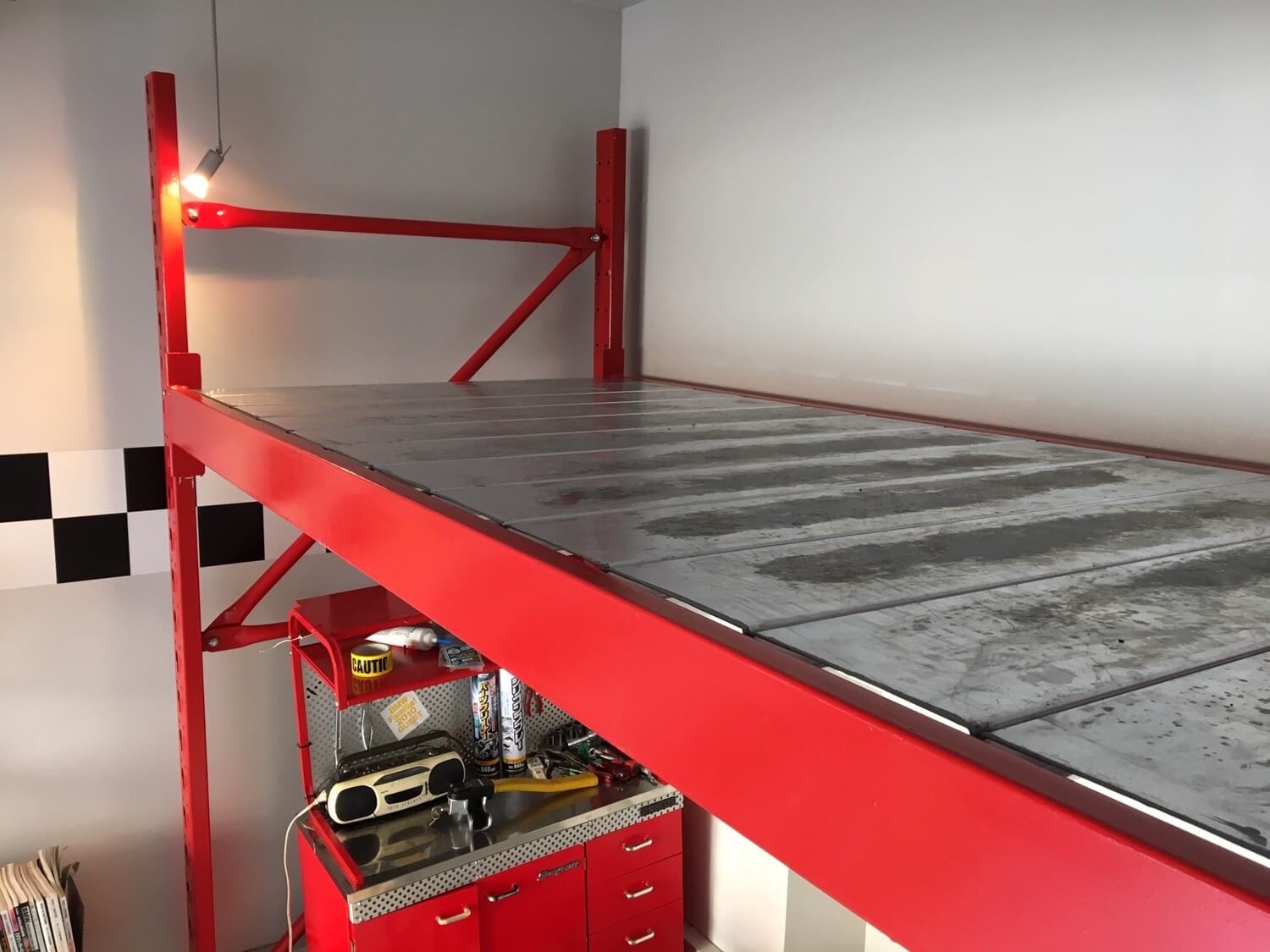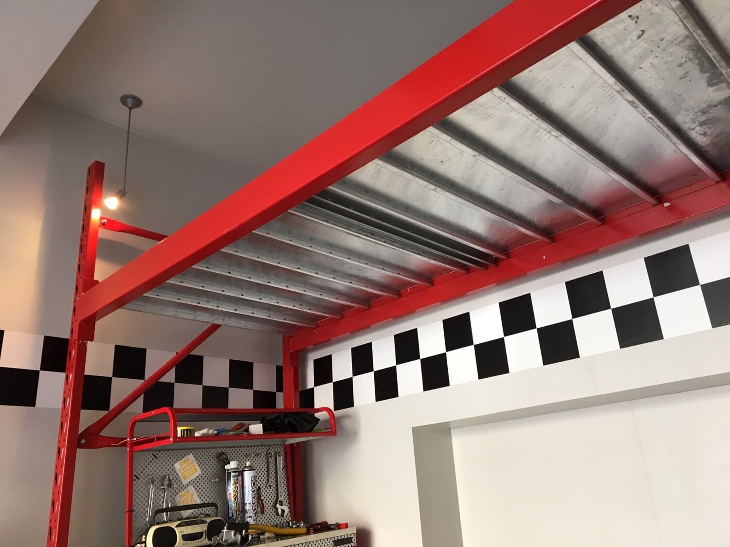 | 担当営業コメント | ご自宅のガレージにガレージロフト風に設置されたいということでご相談いただき、高さ2500 有効間口2800 奥行き1200のパレットラックに、亜鉛メッキ加工を施したフロア材を貼る仕様で納品させていただきました。