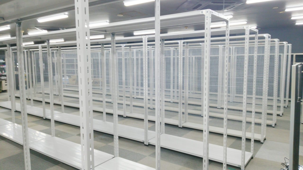 ラックの片面には、落下防止の為の金網を取付けており、中段はフック固定を検討されております。