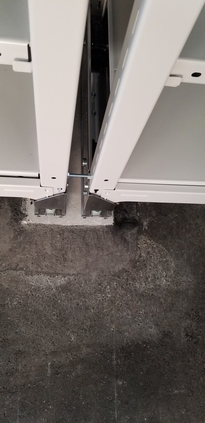 床にアンカーを直接打つノンモルタル施工でご依頼いただきましたが、床面がアスファルトだったため、レール設置部分をコンクリート床にする工事を施しました。 レール長5500mmを2列設置いたしました。 台車はそれぞれ別ですが、横並びになるラックをボルトで連結して、2台一気に動かせるように施工しています。 載せるものの重量などで不便を感じましたら、ボルトを外せば、それぞれ動かせる移動棚になります。 オプション 足踏式ストッパー |