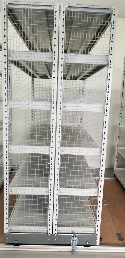 | 営業担当コメント | 新設建屋内にレール式移動棚をご導入いただきました。今回は2台の棚を1台の台車へ積載する【複式移動棚】仕様にしております。 ※複式移動棚は単式(1台の台車に1つの棚)に比べて積載効率に対してのコストで優れ、移動棚自体の安定性が増します。 レール長5600mmを3箇所に設置いたしました。 オプション 側面パネル 側面金網 足踏式ストッパー |