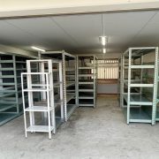 背面を壁にピッタリつけず話して設置しているため、メンテナンスが容易にできているとのこと。 ケーブル類を調整したり、背面を確認することが多いものを置かれる場合はそのほうが使い勝手がよいですね。 お送りいただきましたのは千葉県でお使いのお写真ですがその他の施設にも同じく200kgのスチールラックを導入していただいております。
