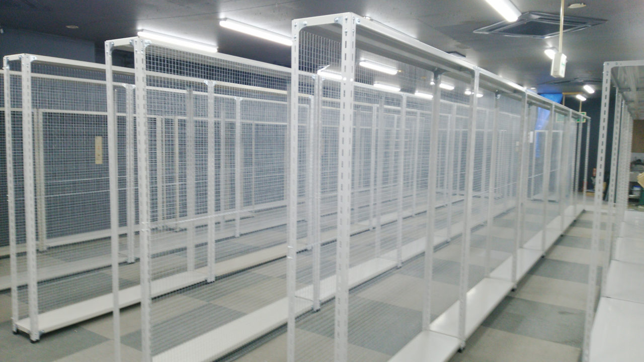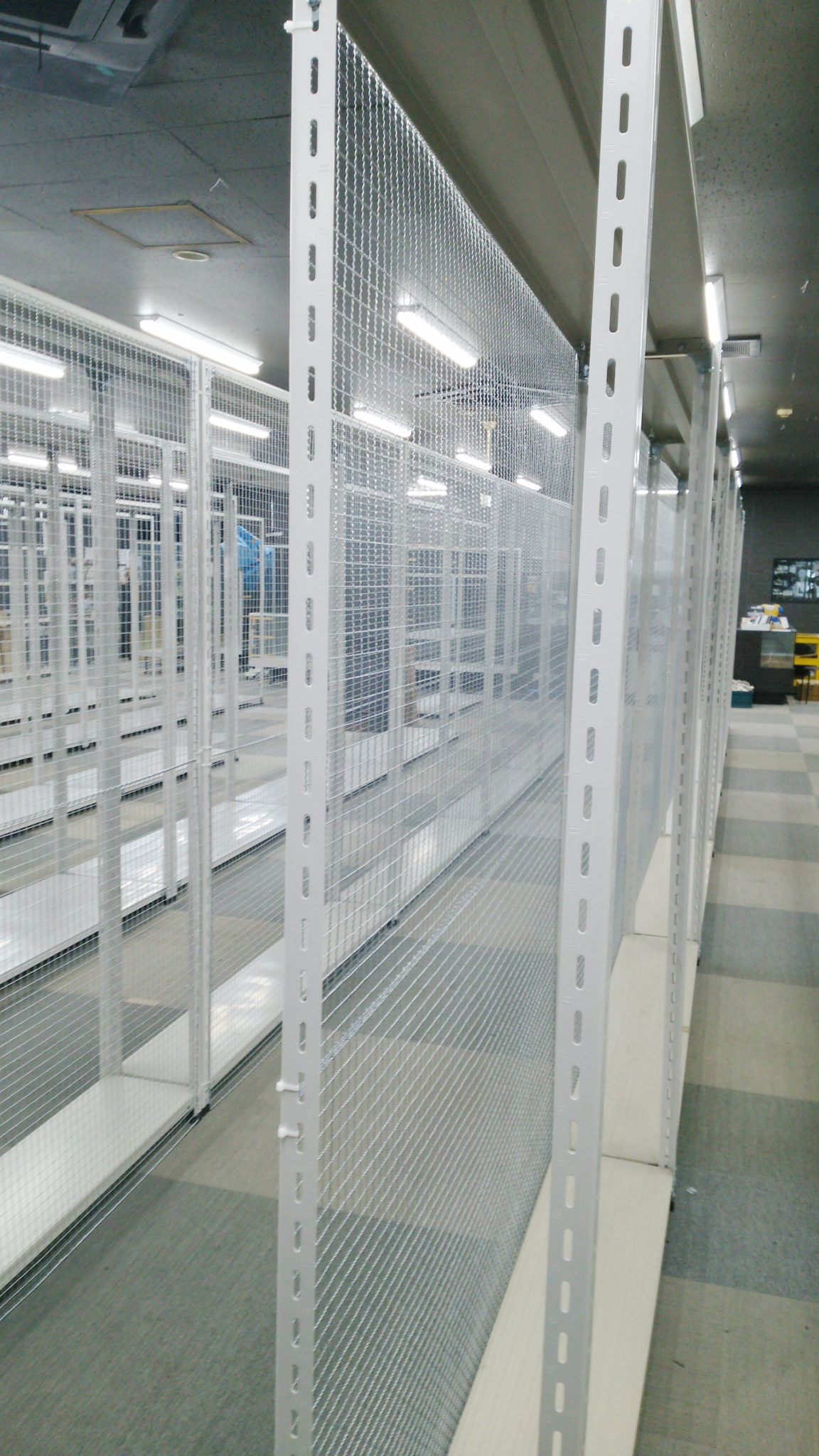 ラックの片面には、落下防止の為の金網を取付けており、中段はフック固定を検討されております。