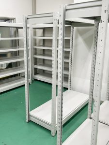 導入した耐荷重300kg/段の中量ラックは、1段あたり300kgまで積載可能です。